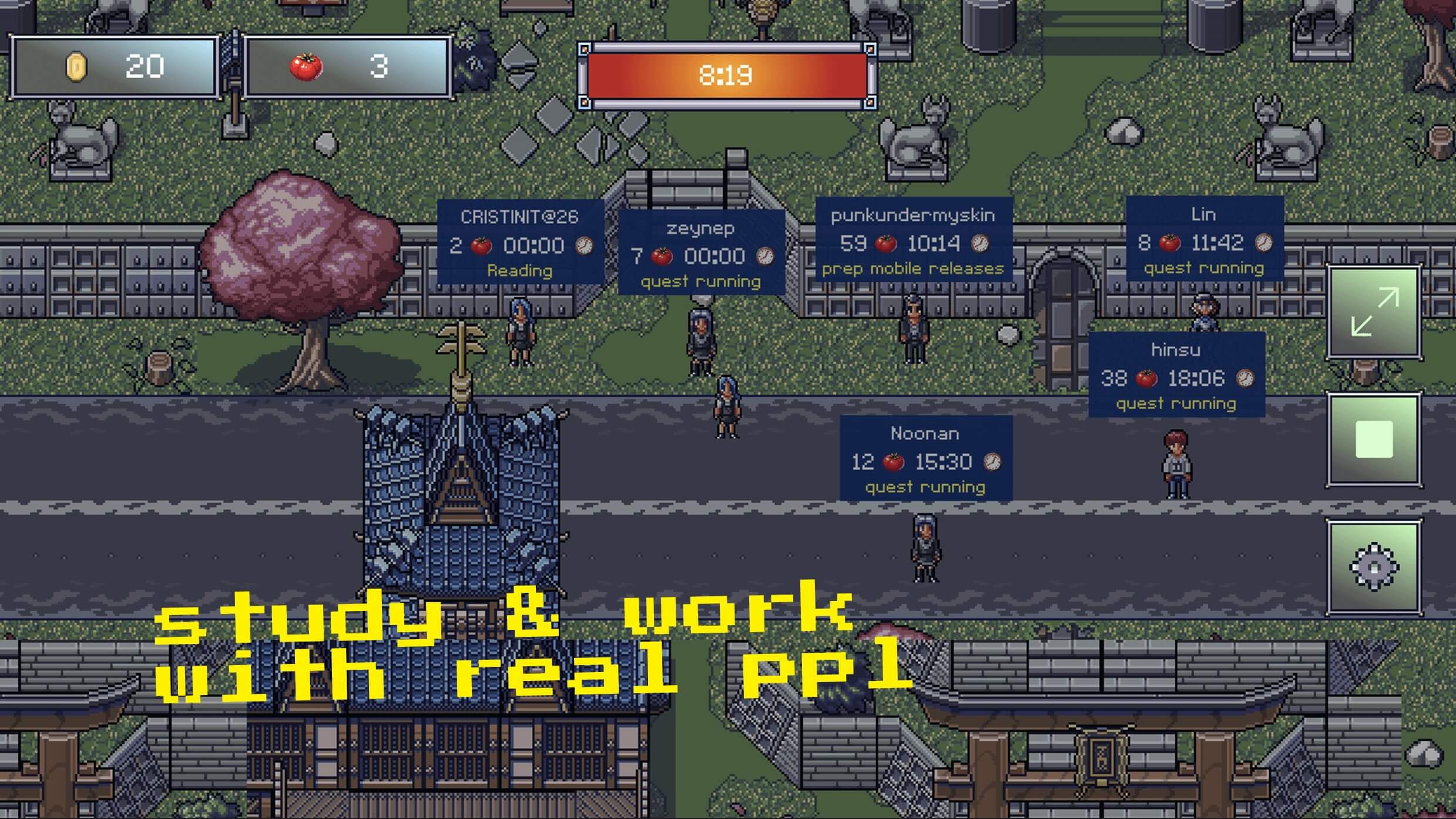 start a focus session, watch your character explore a growing city, unlock new rooms, collect items, and meet friends. see other people grinding in real time or just chill solo. all progress, no pressure.